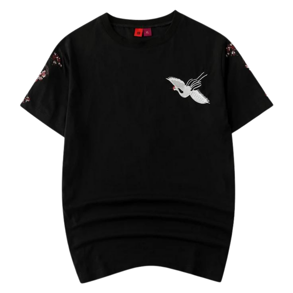 Ce t-shirt oiseau vous habille d'un véritable haiku visuel porté à même la peau. Les grues et les fleurs de cerisier brodées racontent une histoire de grâce et de liberté. Associez-le à un kimono cardigan et des sneakers minimalistes de notre collection pour laisser parler cette estampe streetwear. Ce t-shirt japonais est la plume des écrivains urbains qui savent que la vraie poésie se vit autant qu'elle se lit !