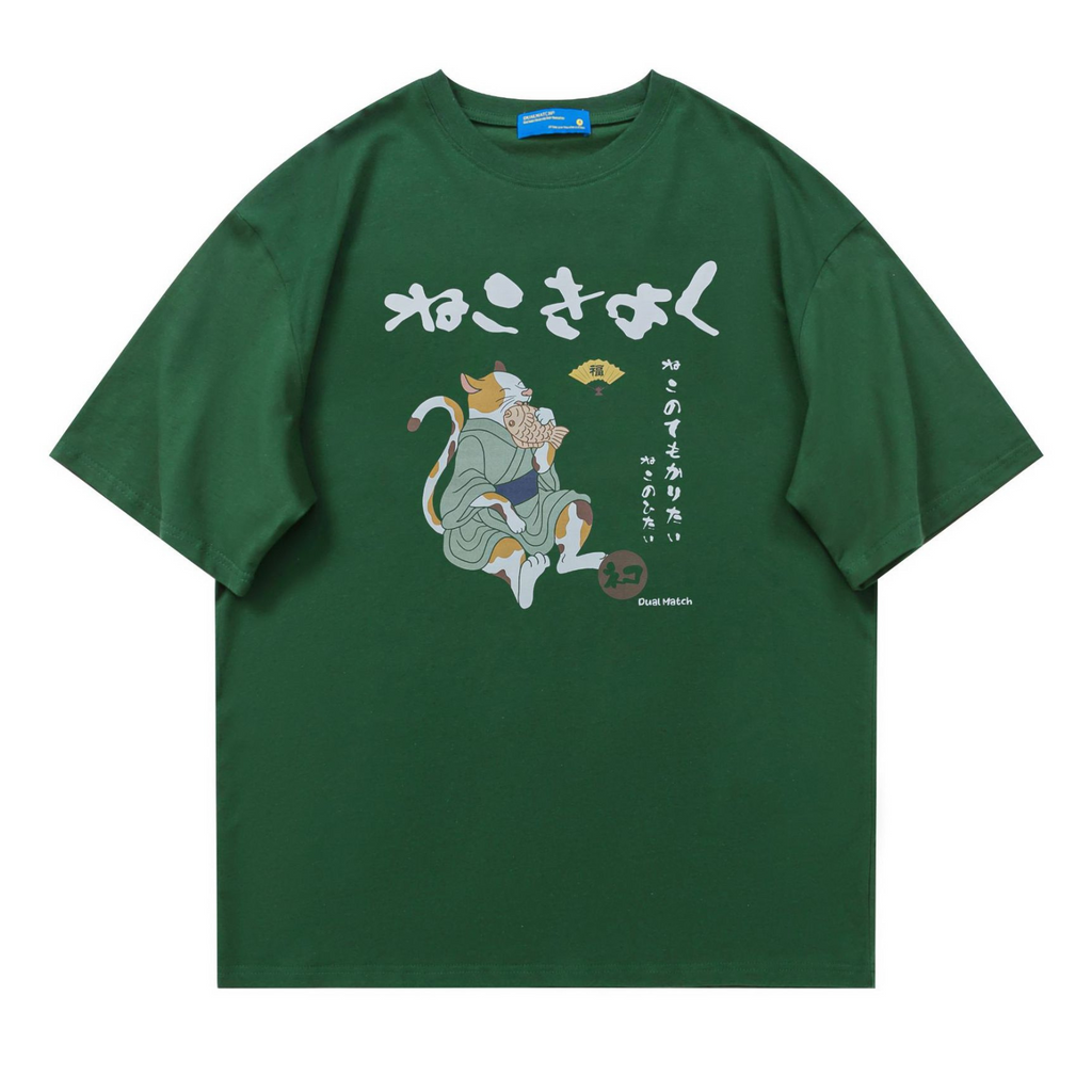 Le t-shirt japonais traditionnel débarque pour révolutionner votre garde-robe streetwear. L'imprimé met en scène un neko anthropomorphe qui se régale d'un taiyaki, vêtu d'un kimono vert qui ferait pâlir d'envie les geishas de Gion. Avec son inscription "Neko-sama", soit "Seigneur Chat", référence humoristique à l'obsession des Japonais pour les félins, devenez un ambassadeur de la culture nippone, entre pop culture et vibe street !